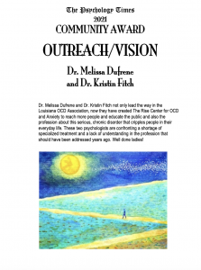 The Psychology Times honored Drs. Dufrene and Fitch with the Psychology Times 2021 Community Award for Outreach/Vision for the creation of Rise Center for OCD and Anxiety and their work with OCD Louisiana (more…)